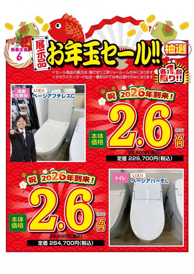 このページでは若林ショールームの商品をご案内しております。お年玉セールの内容は店舗により異なります。お申し込みはイベント期間中にイベント会場にて受付いたします。商品の展示はショールームのみになりますのでご了承ください。お申し込み多数の場合は抽選になります。工事費用については店頭にてご確認ください。申し訳ございませんが、商品の購入のみはできません。