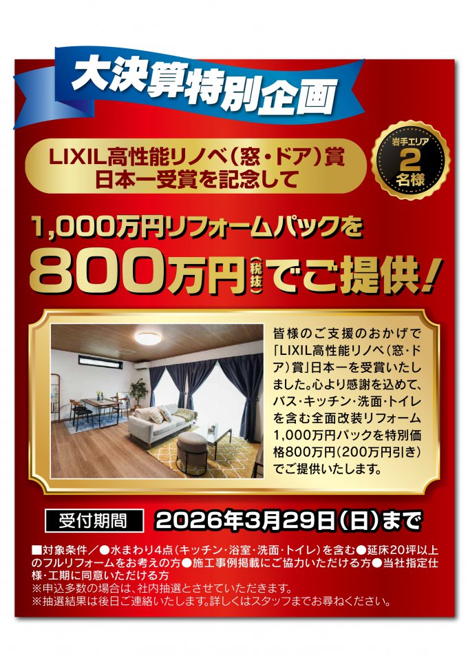 上記でご案内した大決算特別企画は、受付期間内にご来店の上お申し込みいただけた方に限ります。お申し込み多数の場合は抽選になります。安価にリフォームできるチャンスは今だけです。お見逃しなく!