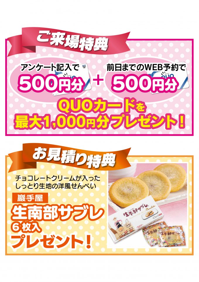 今回は、大決算特別企画として1,000万円リフォームパックを800万円でご提供します!また、ご来場いただいた方には、アンケートご記入で商品券500円分、前日までのWEB予約でさらに500円分の最大1,000円分プレゼント!見積もり依頼いただくと巖手屋「生南部サブレ」プレゼントいたします!年に一度のお得にリフォームできるチャンスです!