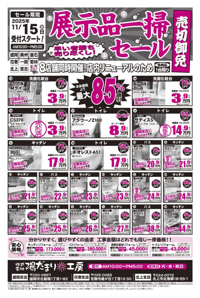 システムキッチン、ユニットバス、洗面化粧台、トイレなどのショールーム展示品を販売します。価格は商品代が最大85%OFFと大特価!セール対象商品は折り込みチラシまたは店頭にてご確認ください。