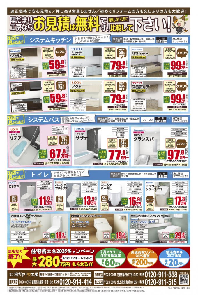 陽だまり工房では、全ショールームで店内リニューアルに伴い、システムキッチン、ユニットバス、洗面化粧台、トイレなどの展示品を一掃する大特価セールを開催いたします。リフォームしたいけど価格の面で踏み切れていなかった方はぜひ、この機会にリフォームをご検討ください。毎年すぐに売り切れてしまう商品が多数です。開始早々に売り切れになってしまった場合は申し訳ございません。各1台限定ですので、お早めにご来店の上ご相談ください。