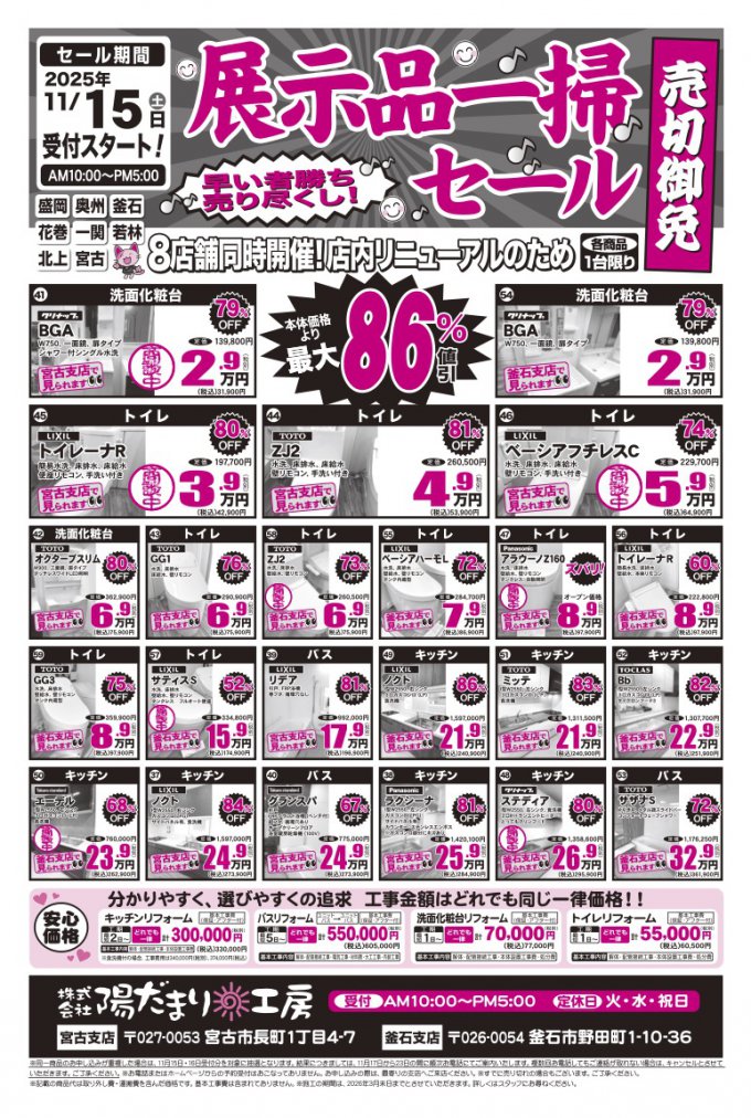 システムキッチン、ユニットバス、洗面化粧台、トイレなどのショールーム展示品を販売します。価格は商品代が最大86%OFFと大特価!セール対象商品は折り込みチラシまたは店頭にてご確認ください。