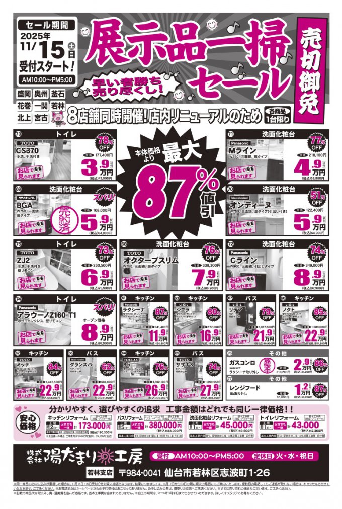 システムキッチン、ユニットバス、洗面化粧台、トイレなどのショールーム展示品を販売します。価格は商品代が最大87%OFFと大特価!セール対象商品は折り込みチラシまたは店頭にてご確認ください。