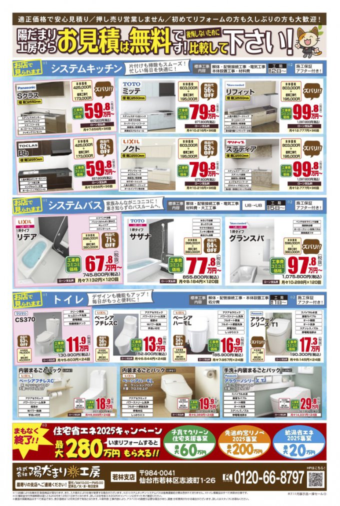 陽だまり工房では、全ショールームで店内リニューアルに伴い、システムキッチン、ユニットバス、洗面化粧台、トイレなどの展示品を一掃する大特価セールを開催いたします。リフォームしたいけど価格の面で踏み切れていなかった方はぜひ、この機会にリフォームをご検討ください。毎年すぐに売り切れてしまう商品が多数です。開始早々に売り切れになってしまった場合は申し訳ございません。各1台限定ですので、お早めにご来店の上ご相談ください。