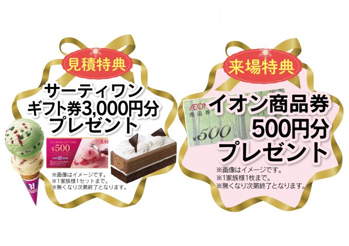 イベント中にお見積もり依頼いただいた方には、サーティワン ギフト券3000円分をプレゼント!お好きなフレーバーを楽しめる、人気の特典です!