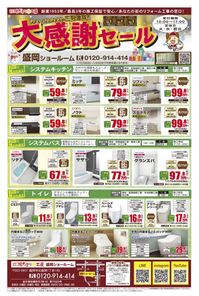 陽だまり工房の「大感謝セール」では、キッチン・お風呂・洗面台・トイレのリフォーム、まとめるとお得な「水廻り4点パック」や、小工事、断熱リフォームなどの、様々なプランをご提案しております。岩手県・宮城県でリフォーム・増改築をご検討されている方は、ぜひお近くの陽だまり工房へ一度ご相談ください。初めてリフォームする方、他社で見積もり中の方も歓迎いたします。お見積もりのご依頼・お問い合わせは、お電話・WEB・ご来店にて承ります。ショールーム見学だけでもOKです!お待ちしております!