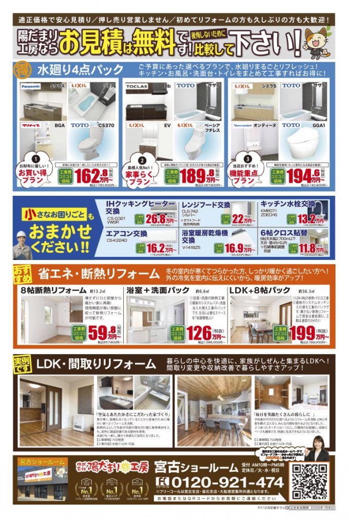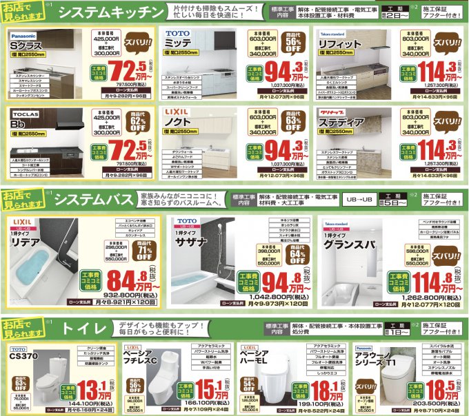 例えば、チラシ裏面では古くなったIHクッキングヒーターの交換やこれからの寒さ対策に欠かせないエアコンの交換など、今なら特別価格でご提供いたします。「どこに頼めばいいかわからない」「まずは相談だけしてみたい」そんな方も大歓迎です!その他にも、お客様のライフスタイルに合わせた最適なご提案をいたします。