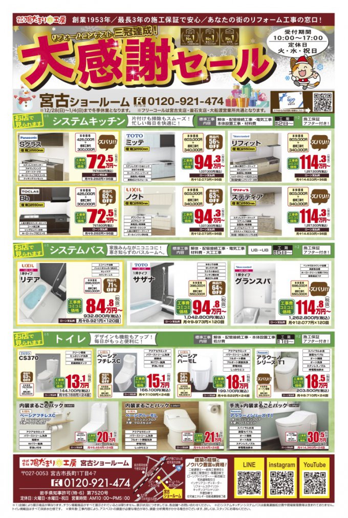 陽だまり工房の「大感謝セール」では、キッチン・お風呂・洗面台・トイレのリフォーム、まとめるとお得な「水廻り4点パック」や、小工事、断熱リフォームなどの、様々なプランをご提案しております。岩手県・宮城県でリフォーム・増改築をご検討されている方は、ぜひお近くの陽だまり工房へ一度ご相談ください。初めてリフォームする方、他社で見積もり中の方も歓迎いたします。お見積もりのご依頼・お問い合わせは、お電話・WEB・ご来店にて承ります。ショールーム見学だけでもOKです!お待ちしております!
