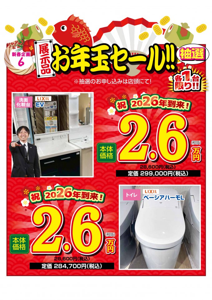 初売りイベント限定企画!2026年にちなんだ特別価格の商品がお年玉セールとして登場。数字の「26」に揃えるため、思い切った特別価格にいたしました!ですので、特別価格でご案内できるのは初売りイベント期間中の3日間限りとさせていただきます。
