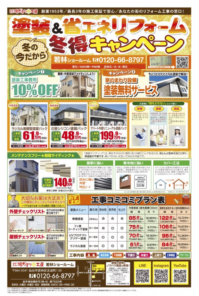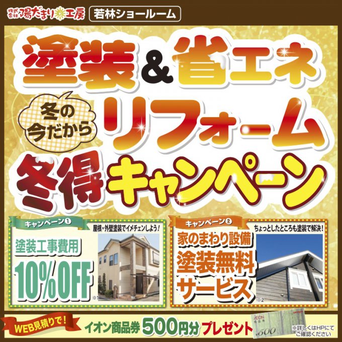 宮城県仙台市近郊にお住まいのリフォーム検討中の皆様へ! 陽だまり工房 若林ショールームより「塗装&省エネリフォーム 冬得キャンペーン」のご案内です。ご自宅の外壁の劣化・色褪せや水廻りの古さ・使いづらさ、室内の寒さなどにお悩みではないですか?そのような方に向けて陽だまり工房では、冬の今だからこそ!お得な塗装リフォームプランと省エネリフォームプランのご提案をいたします。エクステリアのお悩みも、お気軽にお問い合わせください。
