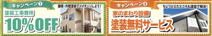 2月末日までにご来場のうえ、お見積り依頼いただいたお客様には、屋根・外壁の塗装工事費用を10%OFF!さらに家のまわりの設備の塗装も無料でサービスいたします!いつかやろう・・・と思っていた塗装工事を始めるなら今が絶好のタイミングです!