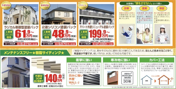 チラシ表面では、おすすめの塗装プランをご紹介しています。掲載内容は一例のため、ご希望に応じて個別のお見積もり・プランのご提案も可能です。現地調査・ご相談・お見積もりはすべて無料ですので、お客様のお悩みをお聞かせください!