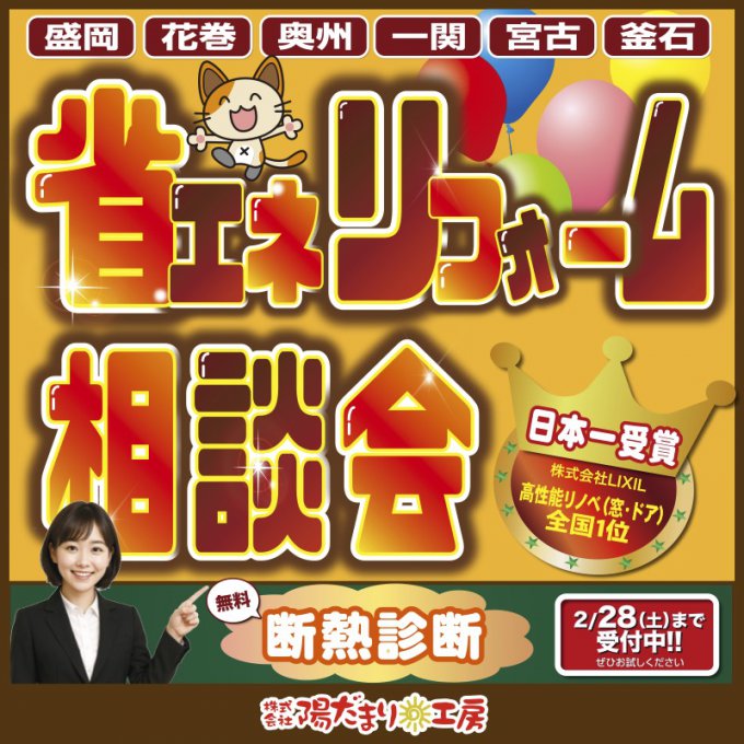 岩手県にお住まいのリフォーム検討中の皆様へ! 陽だまり工房より「省エネリフォーム相談会」のご案内です。ご自宅のお部屋の寒さ・電気代の高さなどにお悩みではないですか?そのような方に向けて陽だまり工房では、お得な省エネリフォームプランのご提案をいたします。併せて、キッチン・お風呂・トイレなどのお悩みも、お気軽にお問い合わせください。