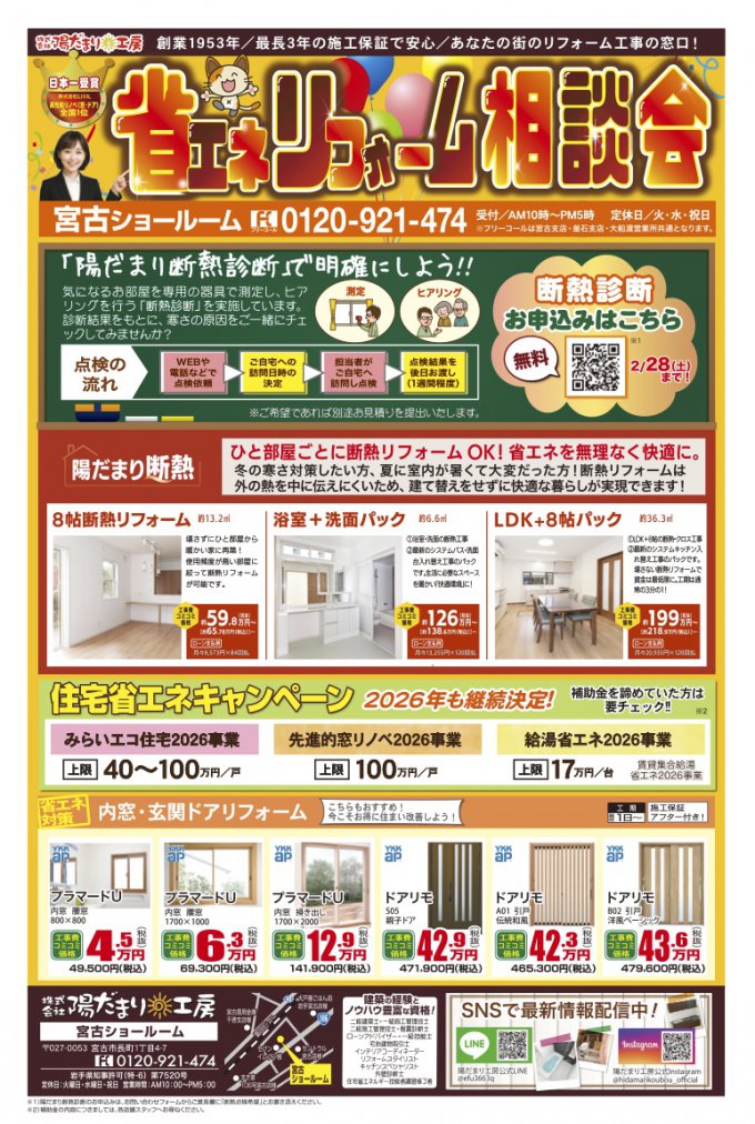 陽だまり工房の「省エネリフォーム 相談会」では、断熱リフォームやキッチン・お風呂・内窓・玄関の工事など、様々なプランをご提案しております。岩手県・宮城県でリフォーム・増改築をご検討されている方は、ぜひお近くの陽だまり工房へ一度ご相談ください。初めてリフォームする方、他社で見積もり中の方も歓迎いたします。お見積もりのご依頼・お問い合わせは、お電話・WEB・ご来店にて承ります。ショールーム見学だけでもOKです!お待ちしております!