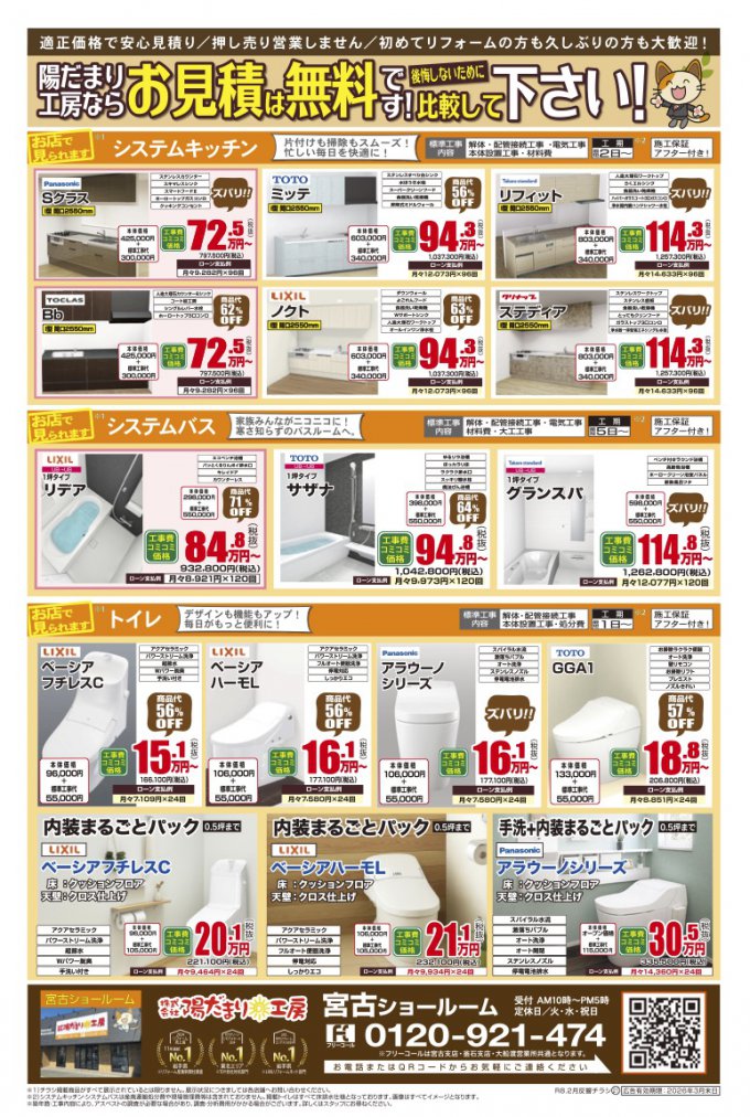 ショールームには、各メーカーの人気商品を豊富に取りそろえて展示していますので、きっと「これだ!」と思える設備に出会えるはずです。おすすめプランはチラシ裏面をご覧ください!チラシに掲載しているのは一部のプランですので、「こんな色にしたい」「仕様を変えたい」などのご要望があれば、お気軽にご相談ください。