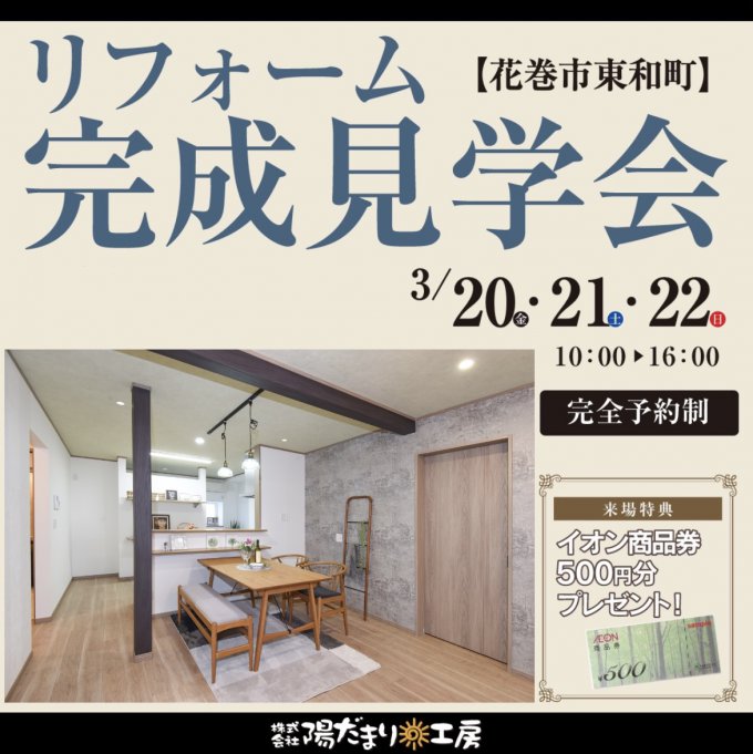 住宅のリフォームや増改築を検討されている方へ向けて、2026年3月20日(金)・21日(土)・22日(日)に渡り、予約制にて「リフォーム完成見学会 in 花巻市東和町」を開催いたします。
