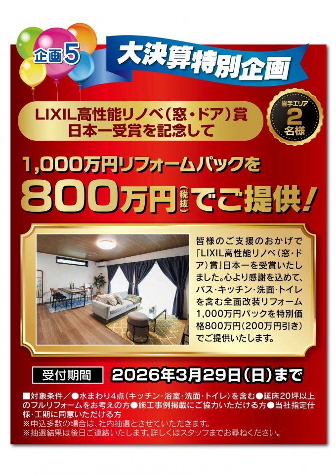 上記でご案内した大決算特別企画は、受付期間内にご来店の上お申し込みいただけた方に限ります。お申し込み多数の場合は抽選になります。安価にリフォームできるチャンスは今だけです。お見逃しなく!