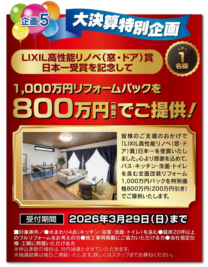 上記でご案内した大決算特別企画は、受付期間内にご来店の上お申し込みいただけた方に限ります。お申し込み多数の場合は抽選になります。安価にリフォームできるチャンスは今だけです。お見逃しなく!