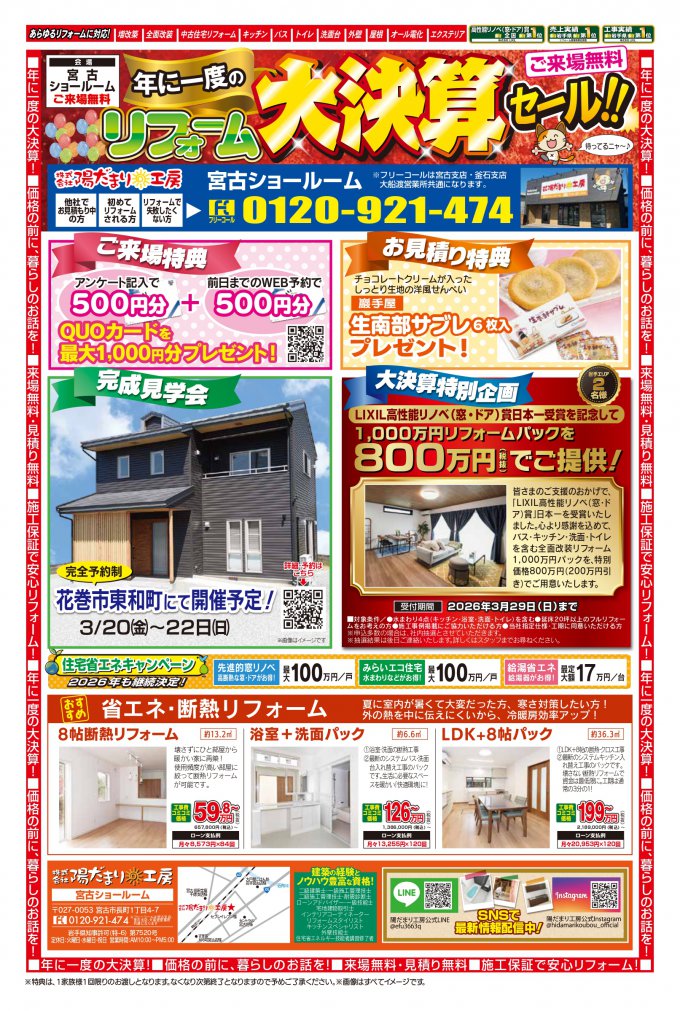 岩手県宮古市近郊にお住まいの皆様へ!陽だまり工房からとってもお得な大決算セールのご案内です!春のはじまり、わが家の新しい一歩を陽だまり工房で!