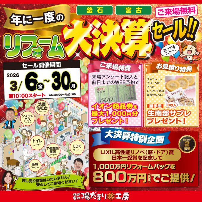 岩手県宮古市近郊にお住まいの皆様へ!陽だまり工房からとってもお得な大決算セールのご案内です!春のはじまり、わが家の新しい一歩を陽だまり工房で!