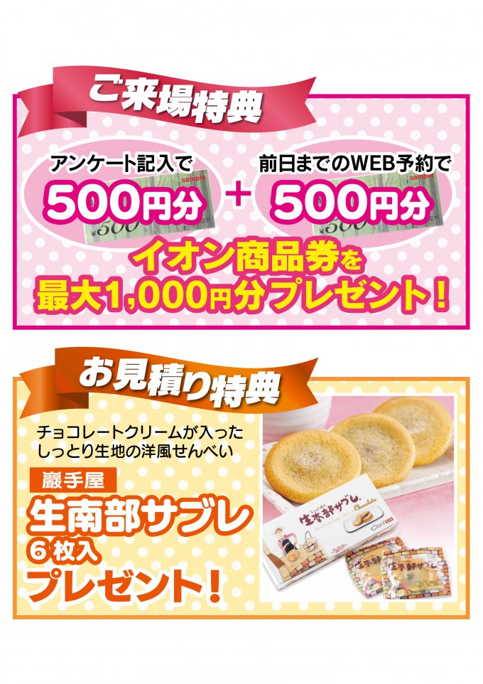 今回は、大決算特別企画として1,000万円リフォームパックを800万円でご提供します!また、ご来場いただいた方には、アンケートご記入で商品券500円分、前日までのWEB予約でさらに500円分の最大1,000円分プレゼント!見積もり依頼いただくと巖手屋「生南部サブレ」プレゼントいたします!年に一度のお得にリフォームできるチャンスです!