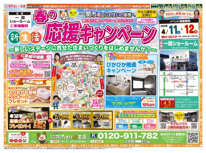 岩手県一関市近郊にお住まいの皆様へ!陽だまり工房から新生活におすすめの新生活応援キャンペーンのご案内です!新しいステージに合わせた住まいづくりを陽だまり工房で!