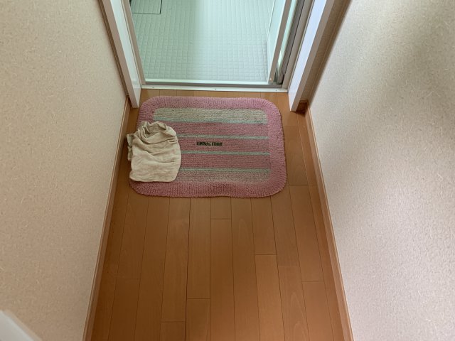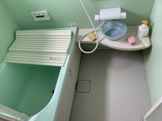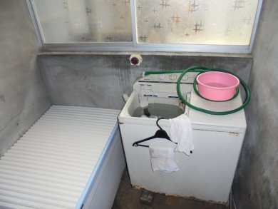 壁や床で、洗濯機を洗い場に置いている状況でした。