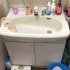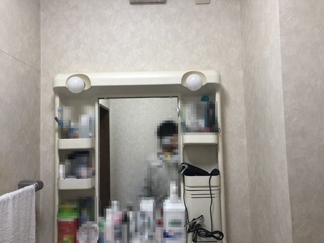 洗面台の扉が壊れ、壁紙が剥がれているところがありました。