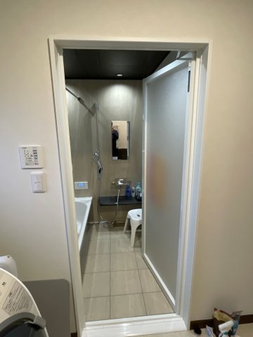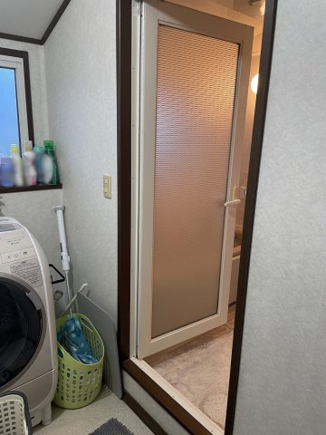 現地調査にお伺いした際にUB入口の開きドアが浴槽側に吊元があり、段差がついておりました。