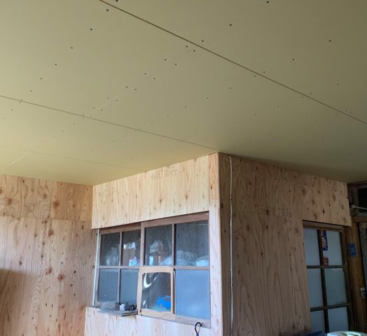 また、下屋の部分は合板と石膏ボードで壁と天井を造作して