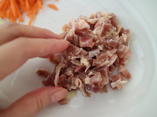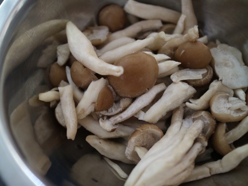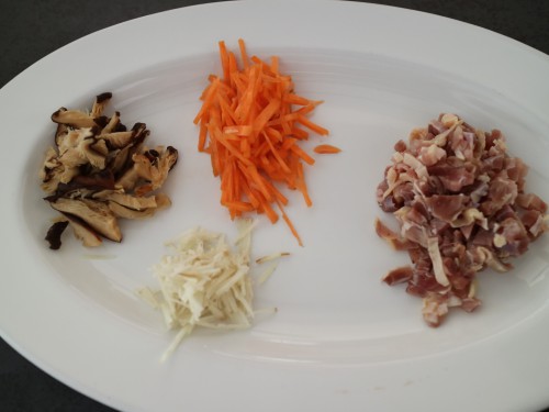①しめじは石突を取って小房に分ける。人参、生姜は千切り、椎茸は石突を取ってスライスしておく。