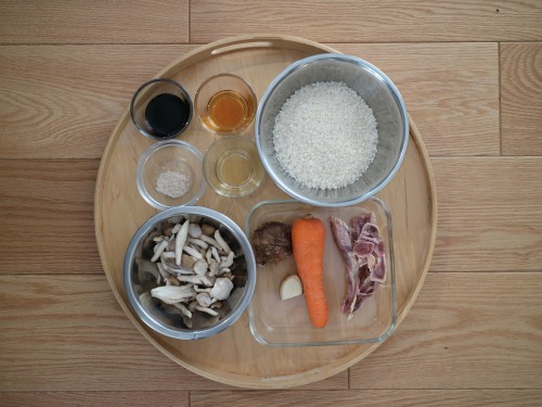 米2合、鶏もも肉80g、しめじ80g、人参1/3本、生姜1片、干し椎茸1個、