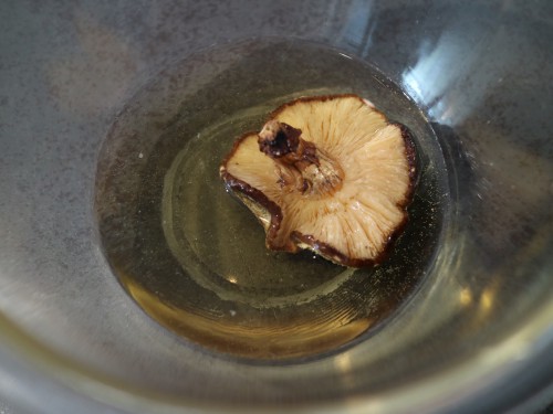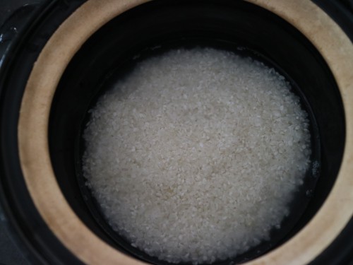 準備: 米は研いで水を切っておく。鶏ももは細かく切って、塩と料理酒1/2を入れて下味をつけておく。干し椎茸は水に浸してもどしておき、戻し汁は取っておく。