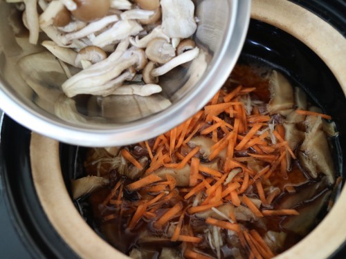 ③その他の調味料と150mlの水を入れてよく混ぜ、鶏肉、生姜、人参、椎茸、きのこを入れて普通に炊いたら出来上がり。
