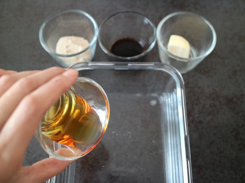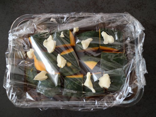 ②耐熱容器に、水と調味料を入れてよく混ぜ、皮を上にして重ならないように並べ、バターをちぎってのせる。ラップをふんわりかけて、両端に隙間を作っておく。