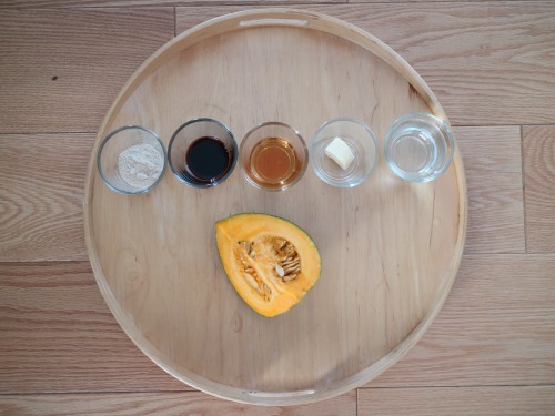 かぼちゃ 1/4個、醤油 大さじ1、みりん 大さじ2、砂糖 大さじ1、バタ ー10g、水 80ml