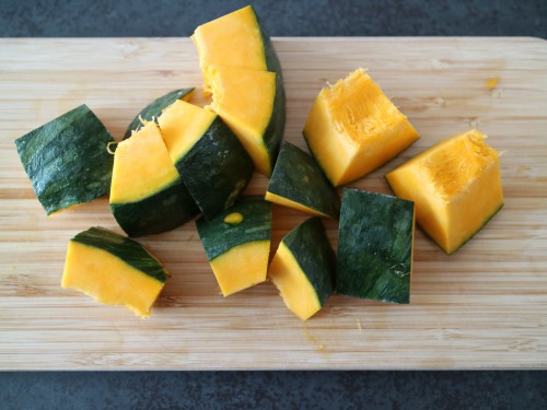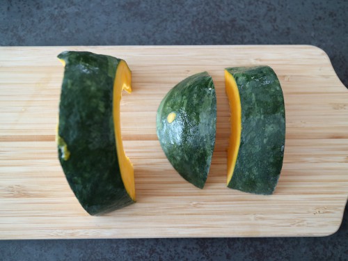 ①かぼちゃは種とワタをスプーンで取り、皮の汚れている部分も包丁などで取っておく。3等分したら、3×3cm程度の大きさにカットしておく。