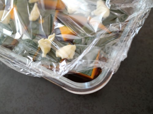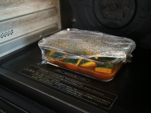 ③電子レンジ600wで7分、加熱する。皮を下にひっくり返して粗熱を取り、さらに皮を上に戻して完全に冷ましたら出来上がり。(冷めるときに味が入る)