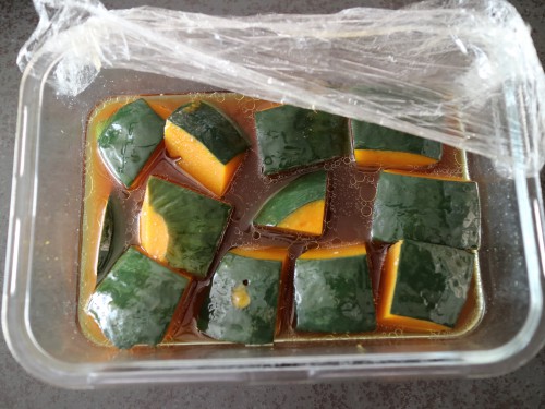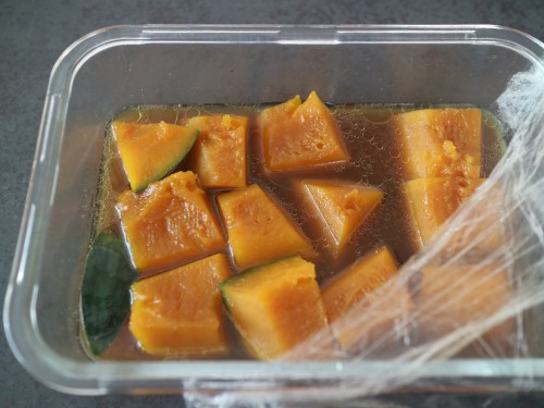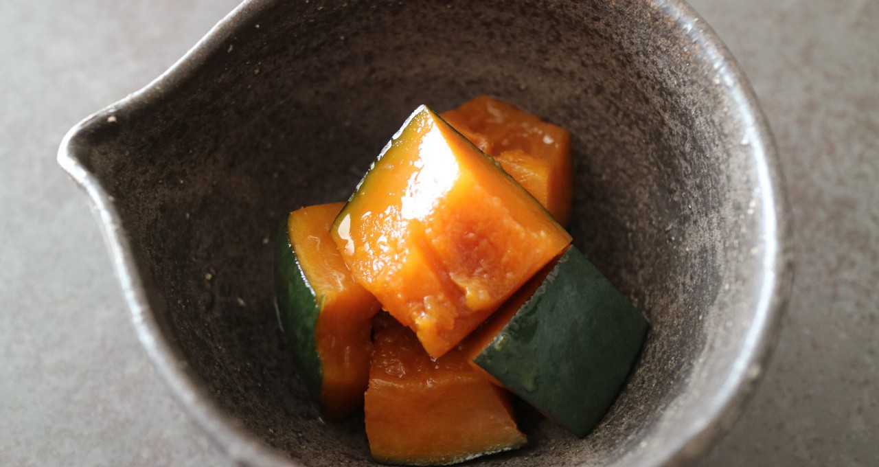 さて、そんなかぼちゃを使った定番の煮物をちょっとだけアレンジして電子レンジだけで作りました。今回は1/4個分のかぼちゃを使いましたが、お弁当に添えるぐらいであれば材料を半分にして作ってもおいしくできます。 ポイントとしては、「①皮を上に向けてレンジ加熱する」こと。皿に当たる接触面がかなり熱くなりますので、皮を下にすると固くなってしまいます。次に「②冷めるときに味が入るのでしっかり冷ます」こと。途中でひっくり返して味をしみこませるのもポイントです。簡単すぎて、鍋に戻れなくなるほど煮崩れもせずおいしく作れますよ。ぜひお試しくださいませ。ではまた来月。