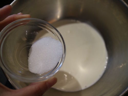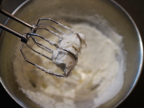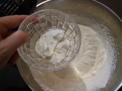 ①よく冷やした生クリームにグラニュー糖を入れ、7分立てにする。ヨーグルトを入れてさらに泡立て、9分立てにする。