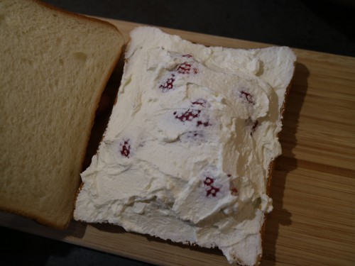 ②1セットにつき生クリームを半分使用する。食パンに生クリームを塗り、ヘタをとったいちごを写真のように並べる。一つは半分にカットし、両脇に配置する。生クリームを重ね、もう一枚のパンを重ね、ラップにくるんだら切る方向に向けてマスキングテープを貼っておく。