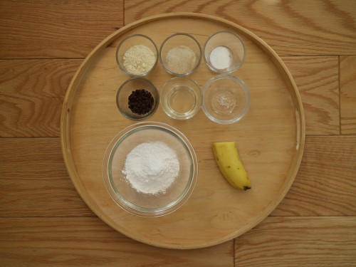 A(米粉60g、アーモンドプードル20g、きび砂糖20g、ベーキングパウダー小さじ1/3、自然塩ひとつまみ)、こめ油または太白ごま油 大さじ2、水 大さじ1+1/2〜大さじ2、バナナ1/2本、チョコチップ大さじ1