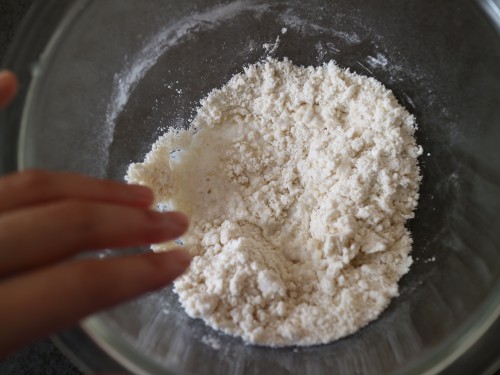 ② こめ油を入れてそぼろ状になるまで混ぜ、水を加えて混ぜる。7mm角に切ったバナナ、チョコチップを入れて混ぜたら生地の完成。
