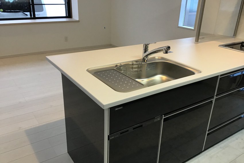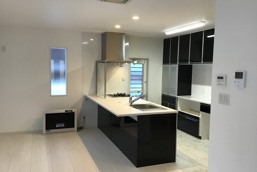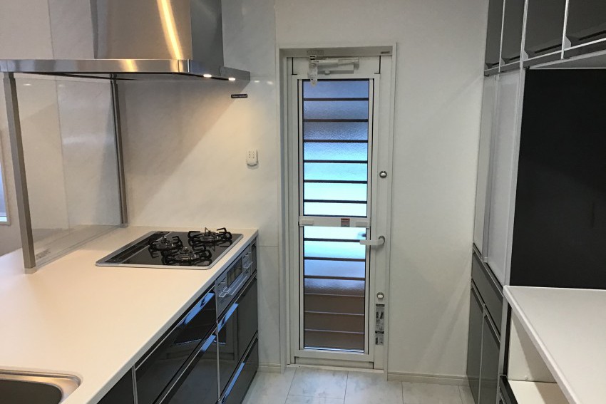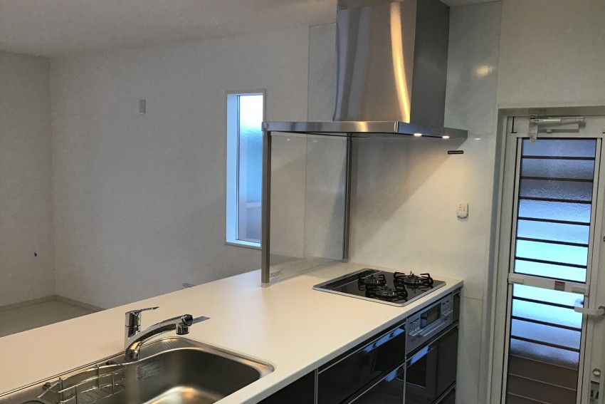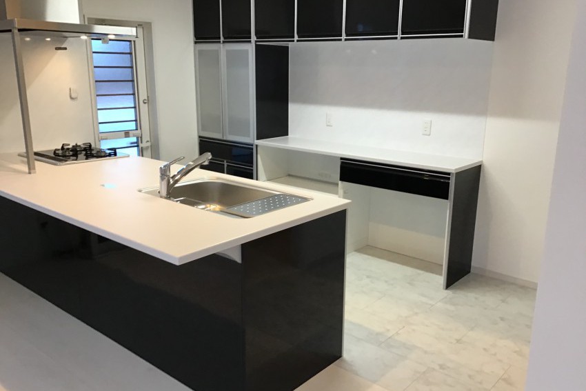 対面キッチンと食器戸棚、家電収納を付けたいとのご要望でしたので、お手入れが簡単なホーローキッチンをご提案いたしました。食洗機も取り付けました。