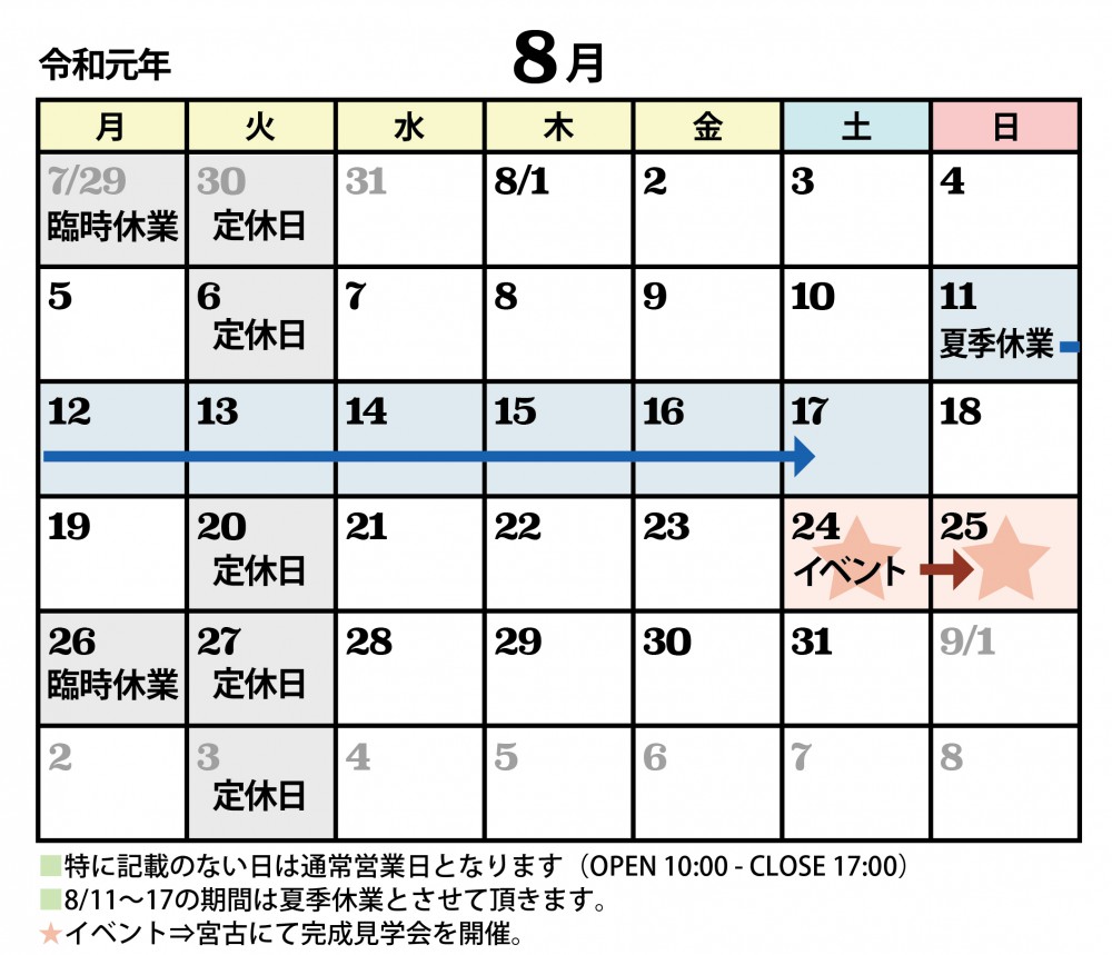 陽だまり工房ショールーム 2019年8月の営業カレンダーになります。