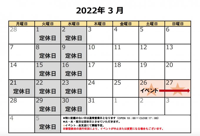 3月は全店でイベントを予定しています! 新型肺炎の流行状況により 中止とさせて頂く場合もございます。 最新情報は当HPまたは Facebookページにてご確認ください。