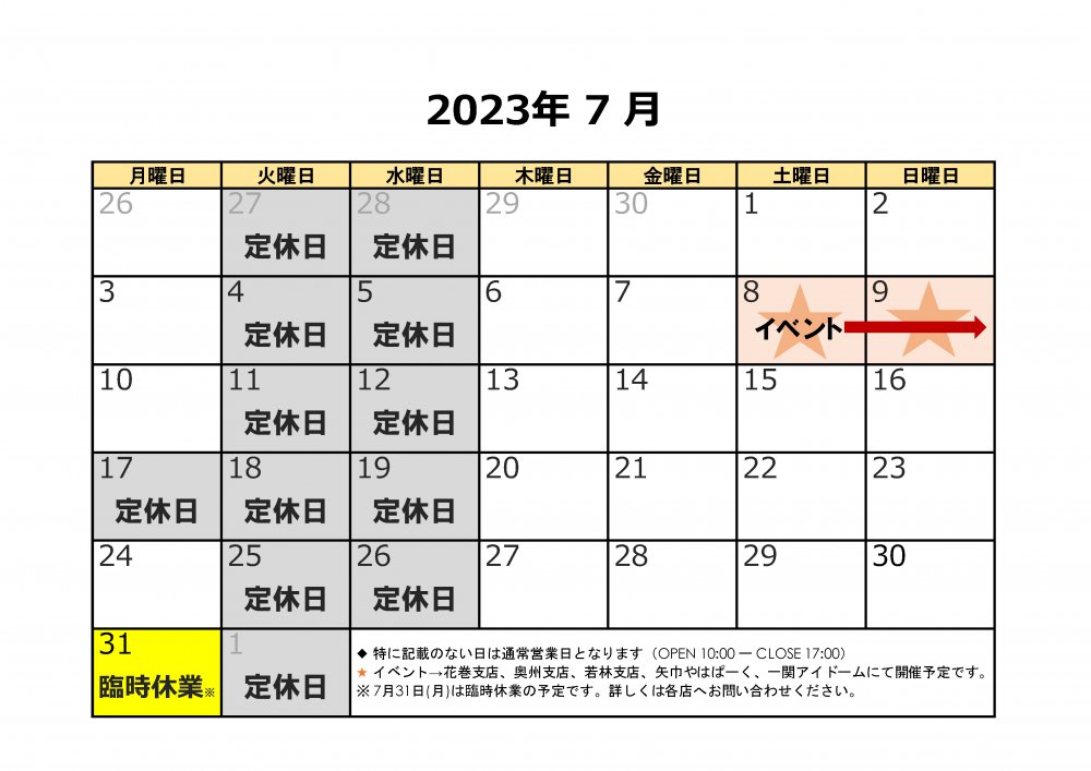 2023年7月の営業カレンダーは以下の通りです。