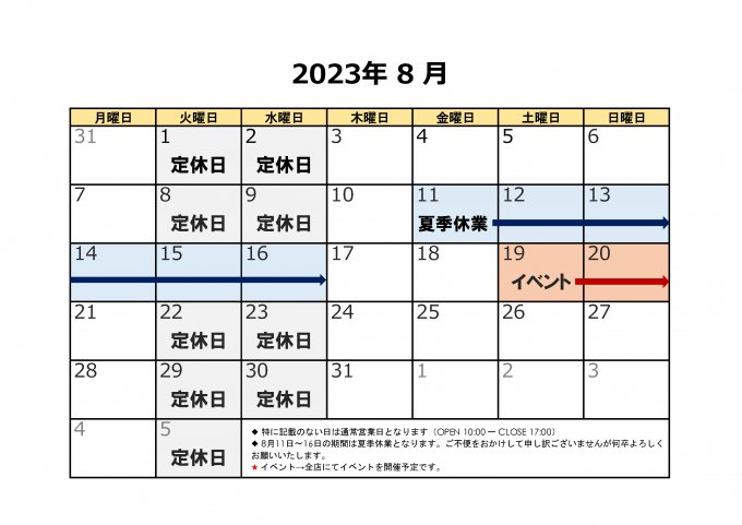 陽だまり工房ショールーム 2023年8月の営業カレンダーは以下の通りです。