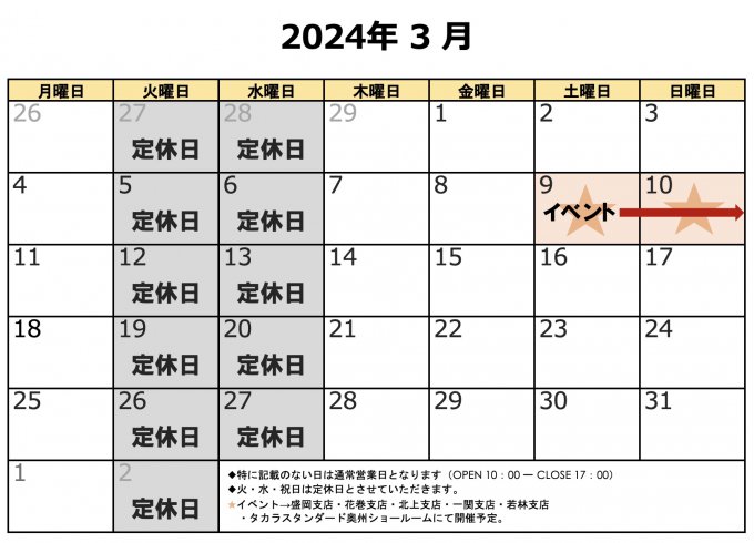 3月の営業カレンダー