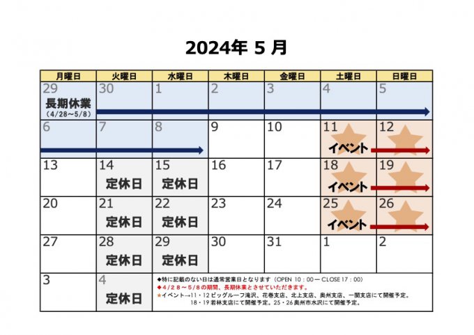 陽だまり工房ショールーム 2024年5月の営業カレンダーは以下の通りです。